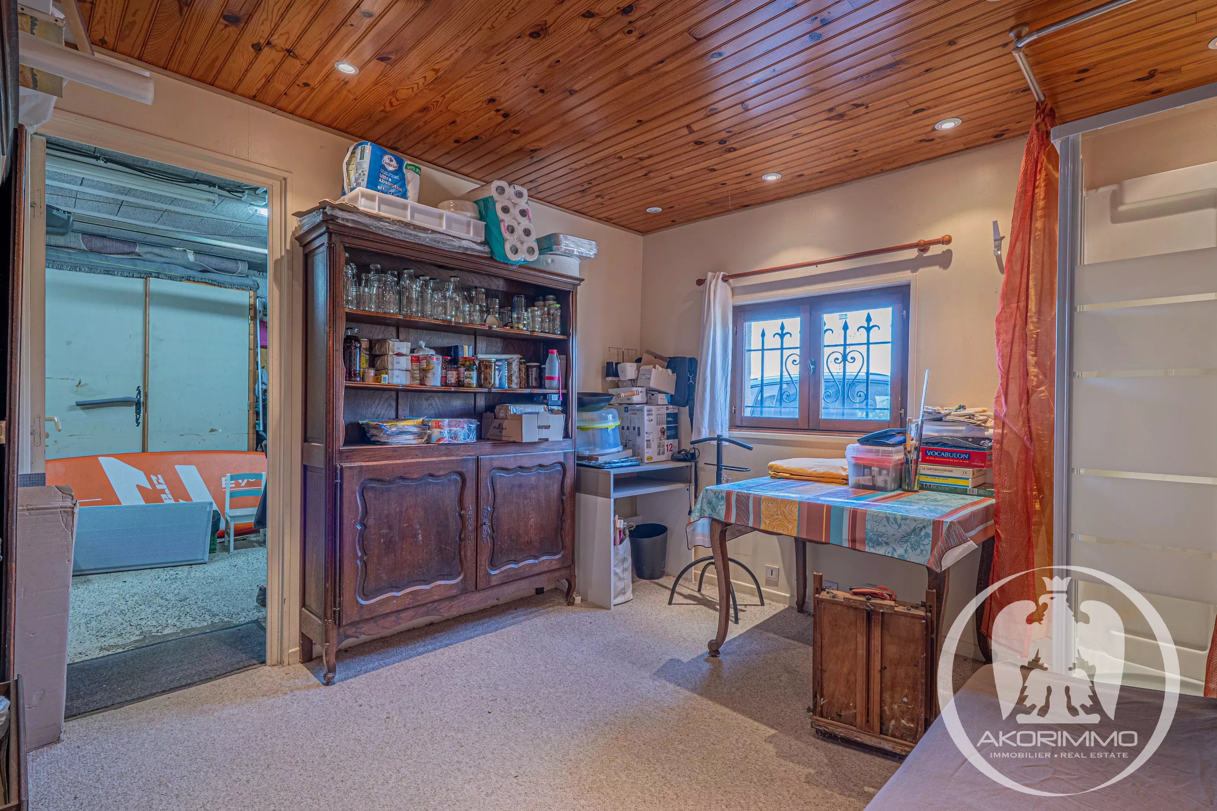 La planta baja incluye un garaje (35 m²), una bodega y una sala independiente con toma de agua.