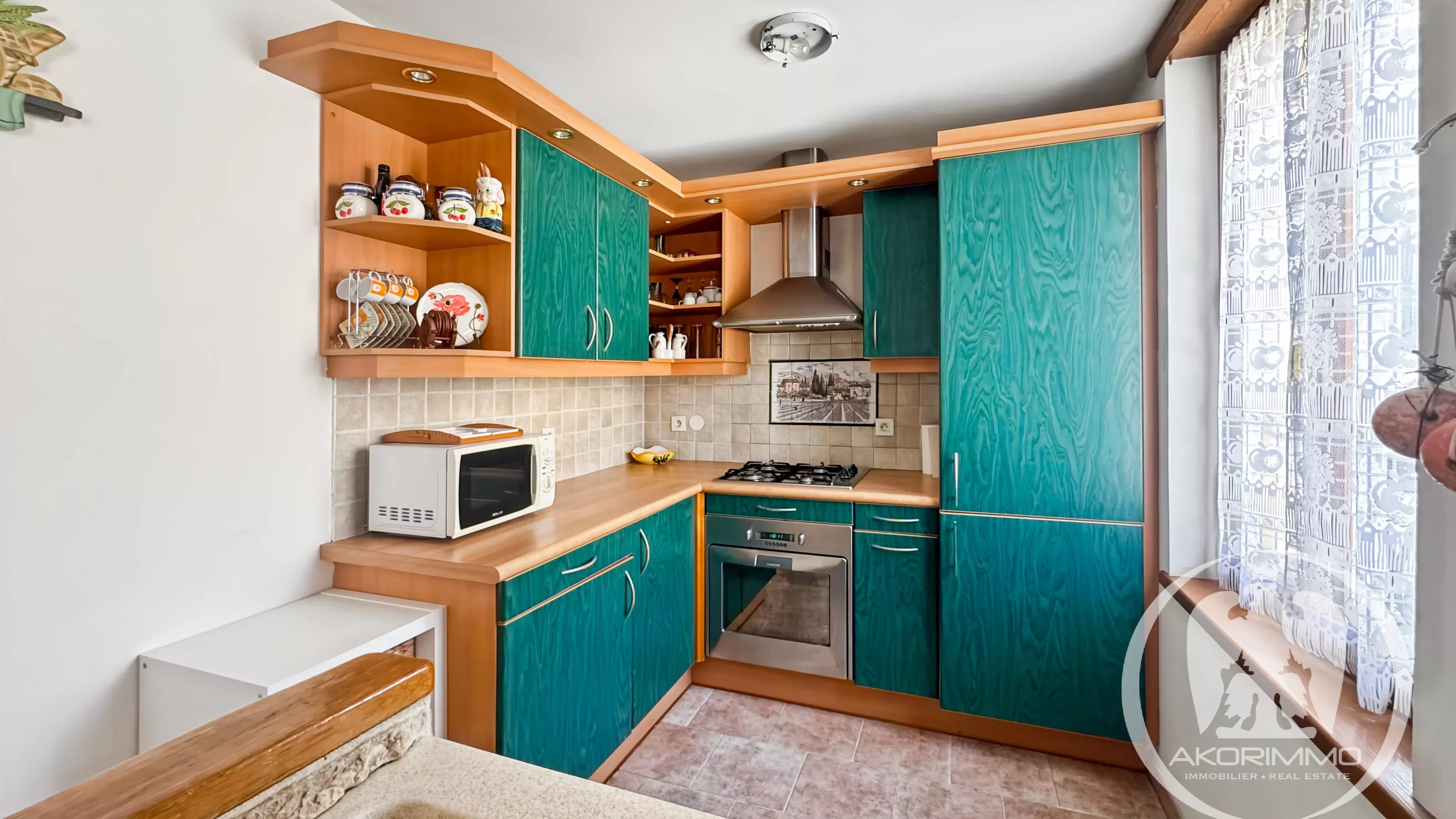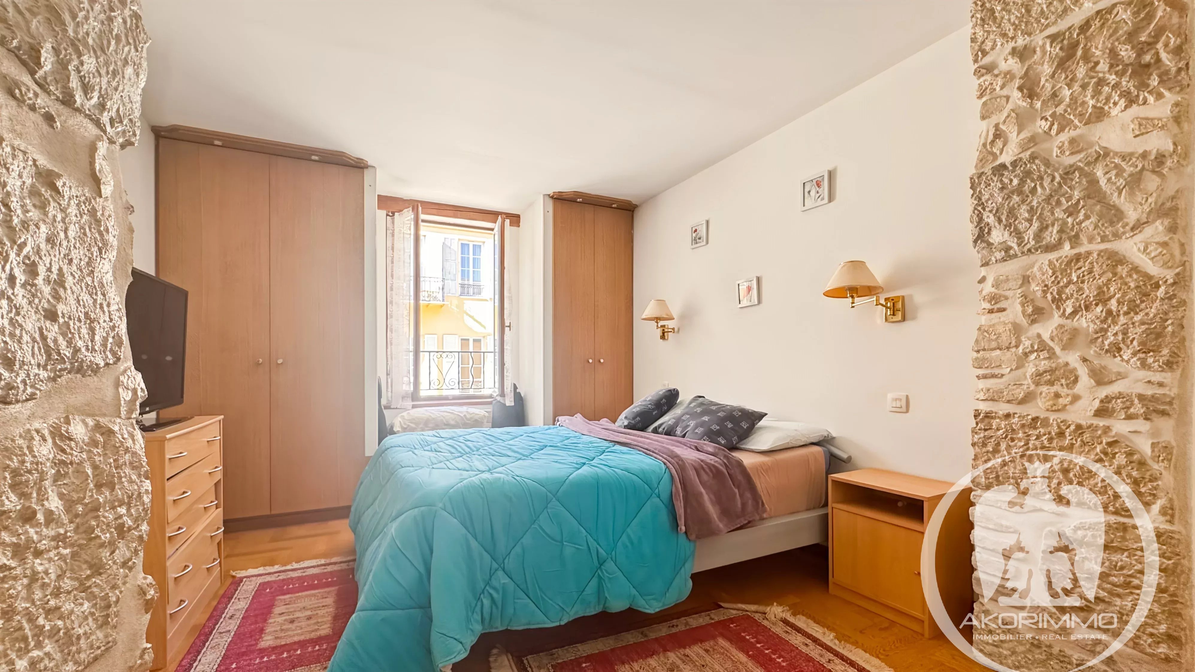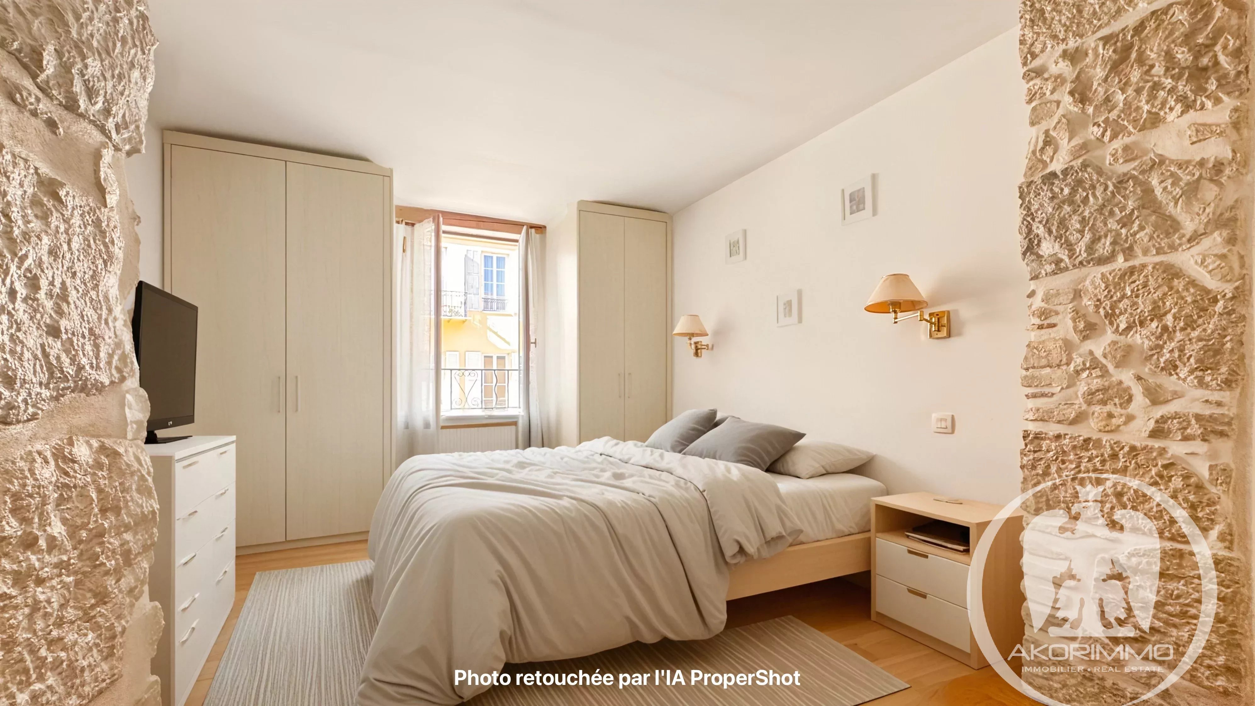 El apartamento seduce por su encanto auténtico, con vigas a la vista y paredes de piedra. También dispone de servicios modernos: doble acristalamiento y aire acondicionado reversible reciente.