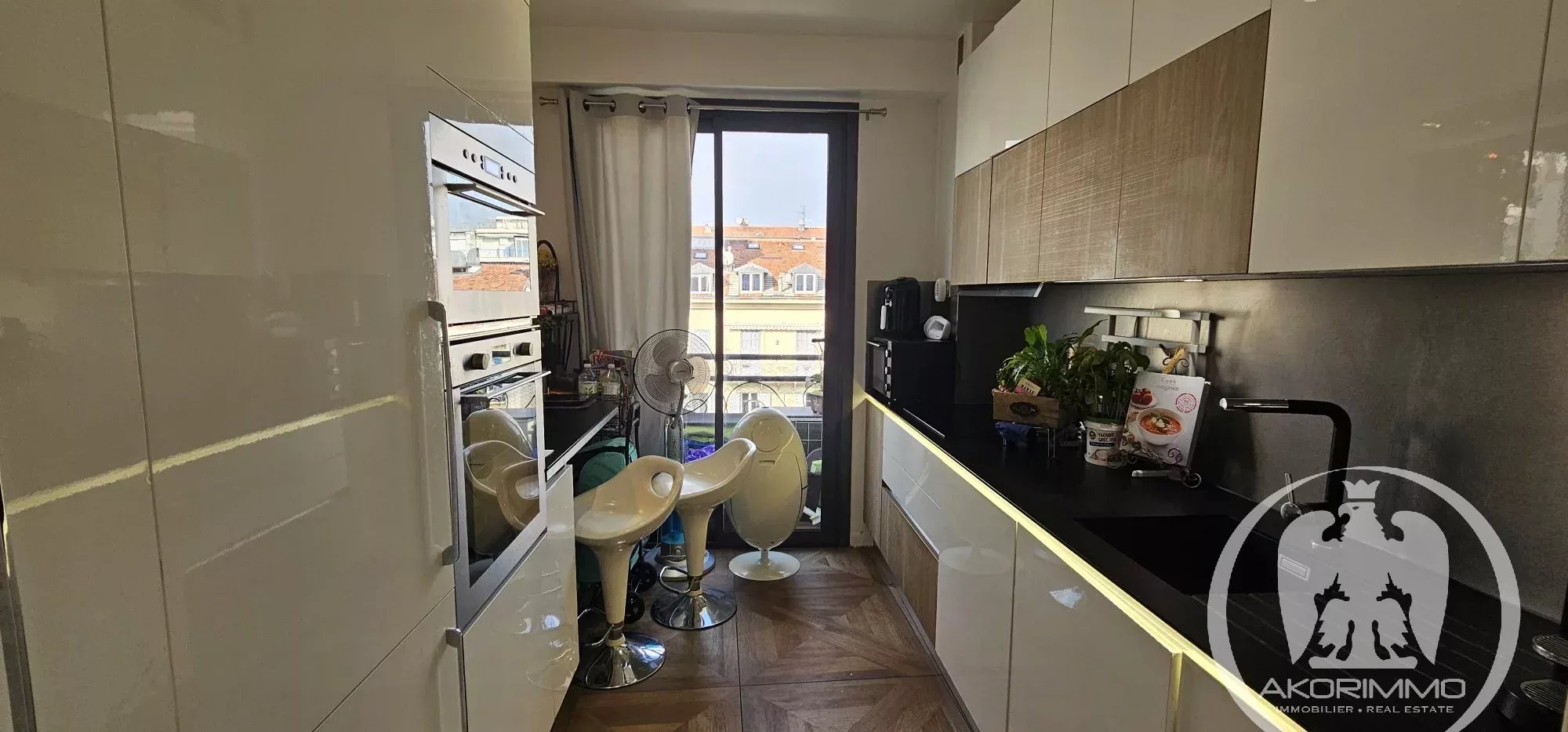 El apartamento encanta por su amplio salón bañado de luz, orientado al suroeste, aprovechando el sol pleno durante todo el día. Una bonita apertura a un balcón permite instalar fácilmente una mesa y dos sillas, ideal para disfrutar del clima de Niza y de las puestas de sol.