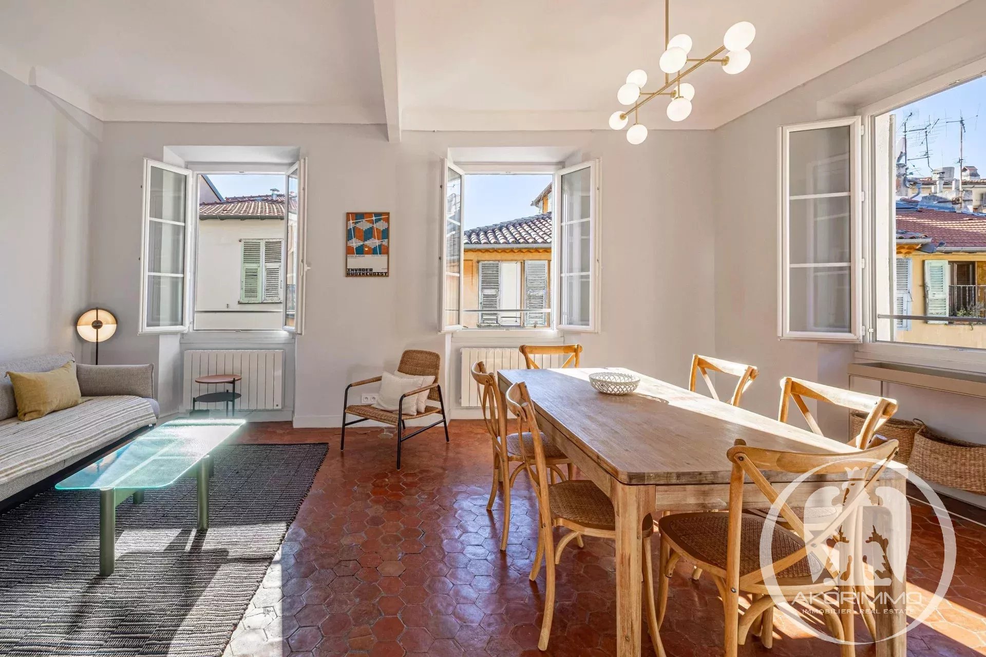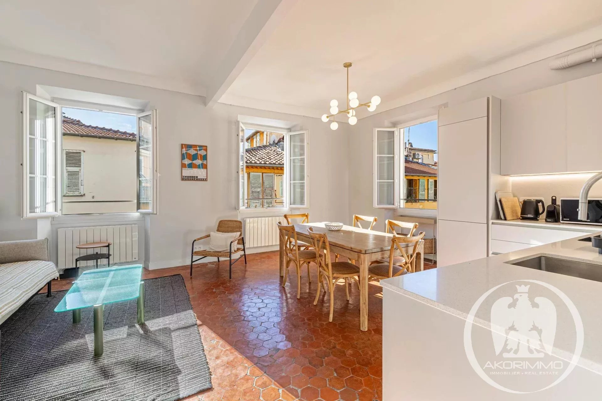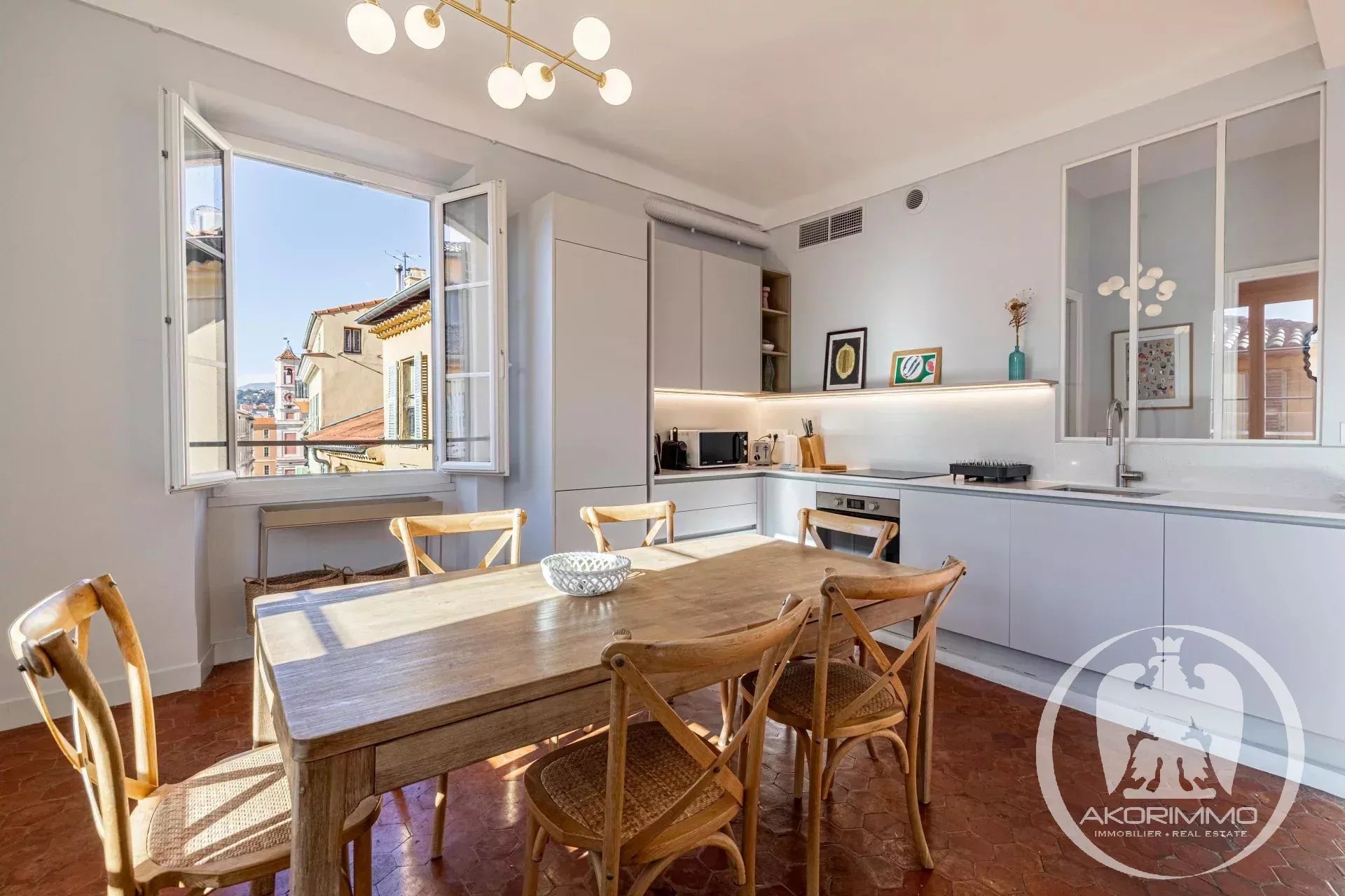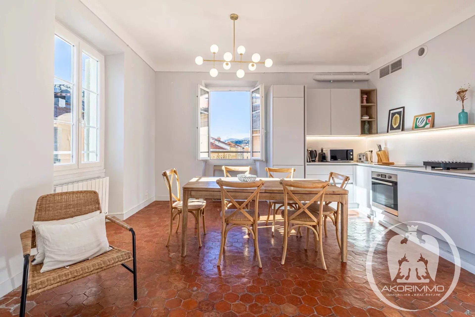 Bañado en luz todo el día gracias a sus tres grandes ventanales en el salón, el apartamento ofrece unas vistas impresionantes de los tejados de Vieux-Nice y de las colinas, en un ambiente tanto tranquilo como auténtico.