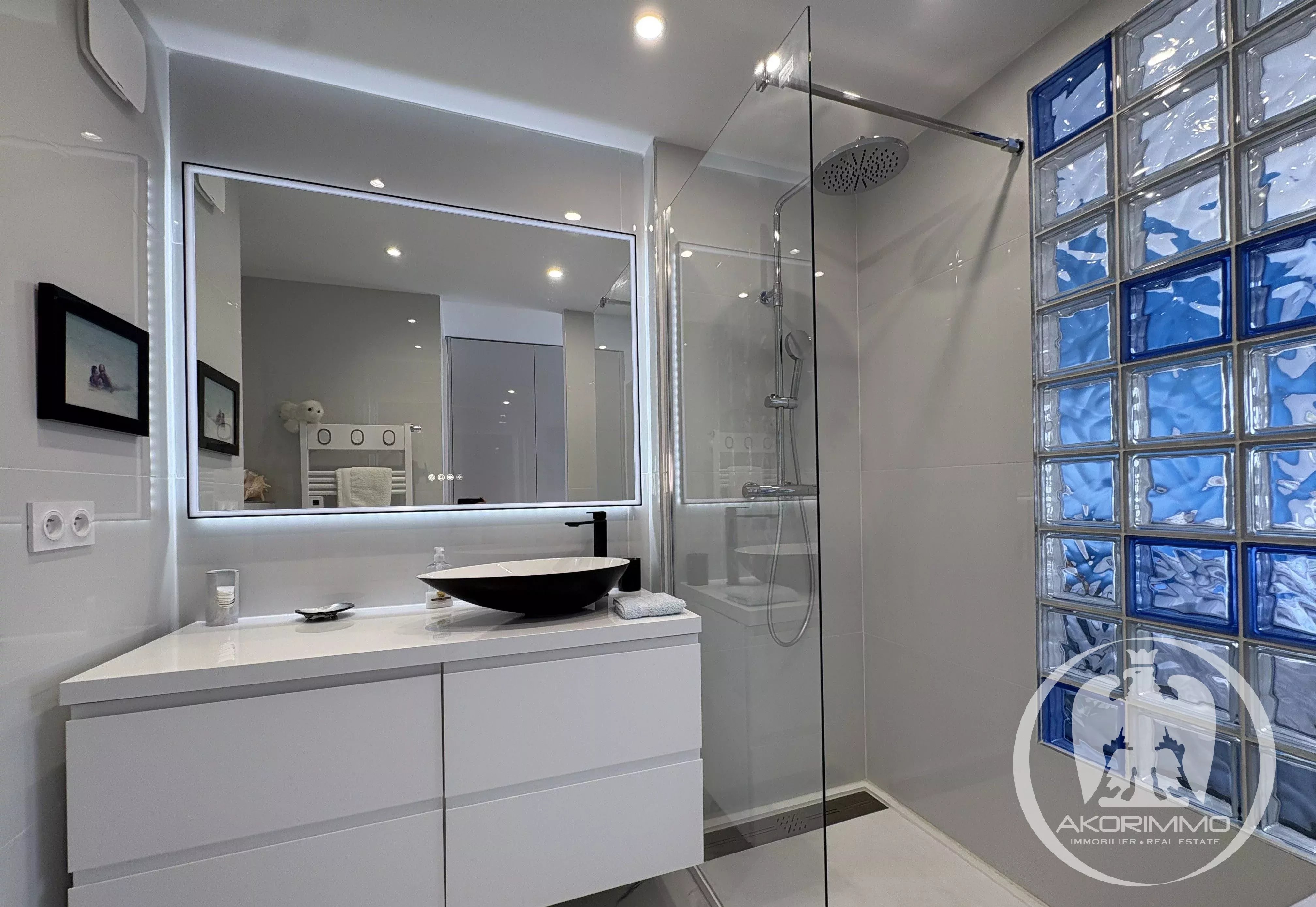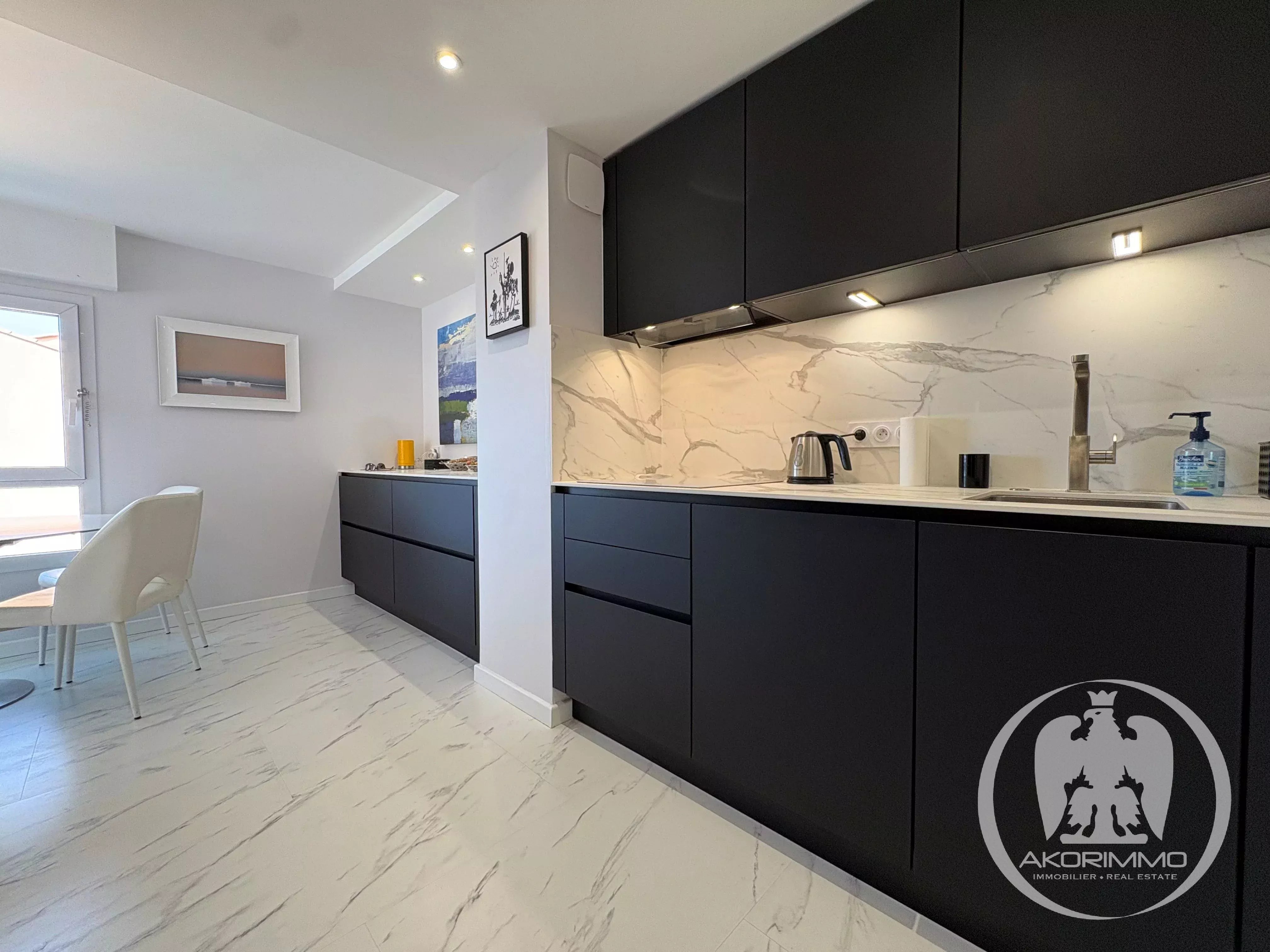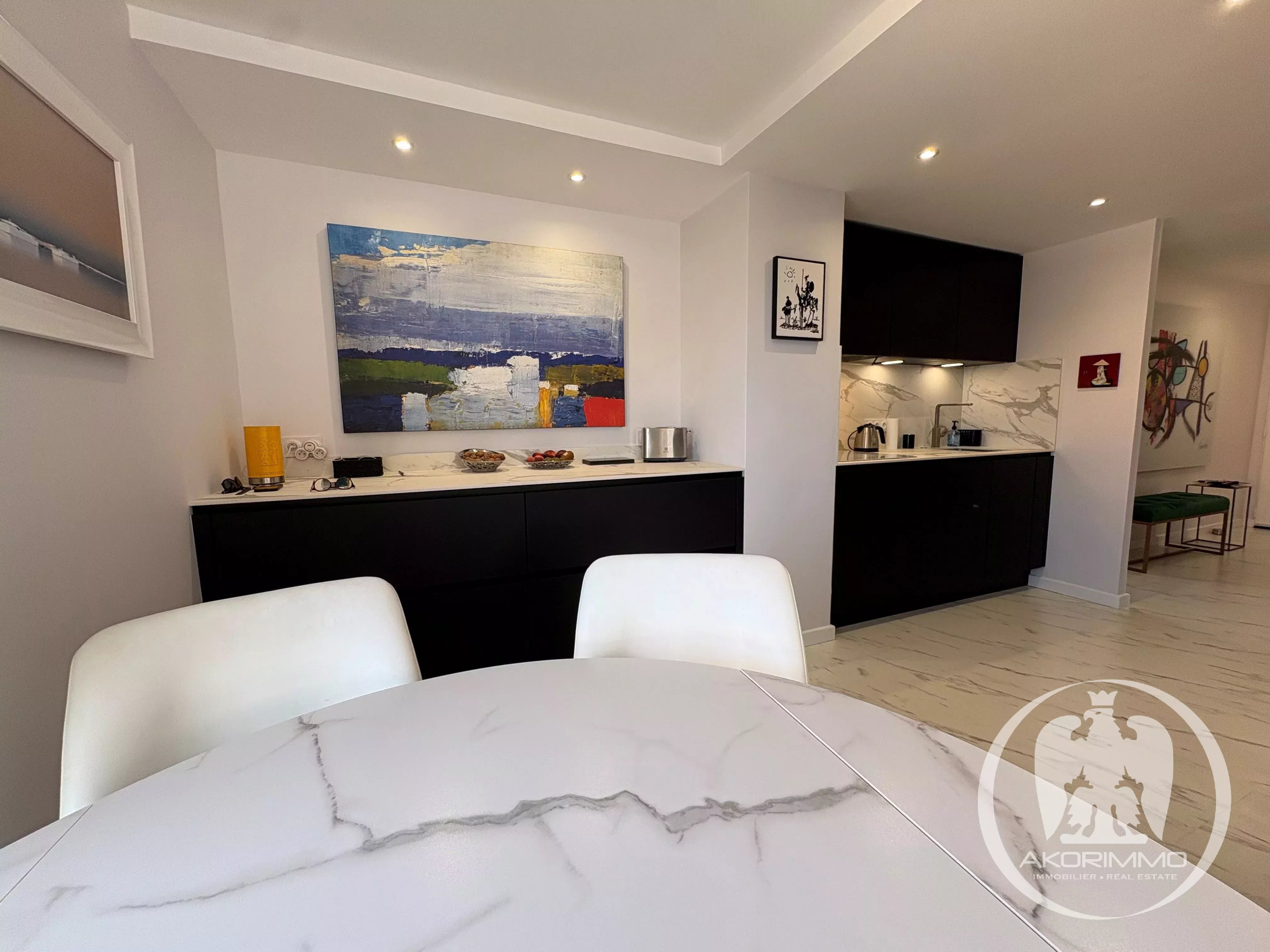 Se compone de la siguiente manera: una entrada con aseo y lavabo, un salón de 27 m² que da a una terraza orientada al sur con una magnífica vista al mar, así como una cocina totalmente equipada con numerosos armarios.