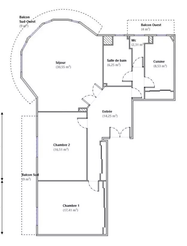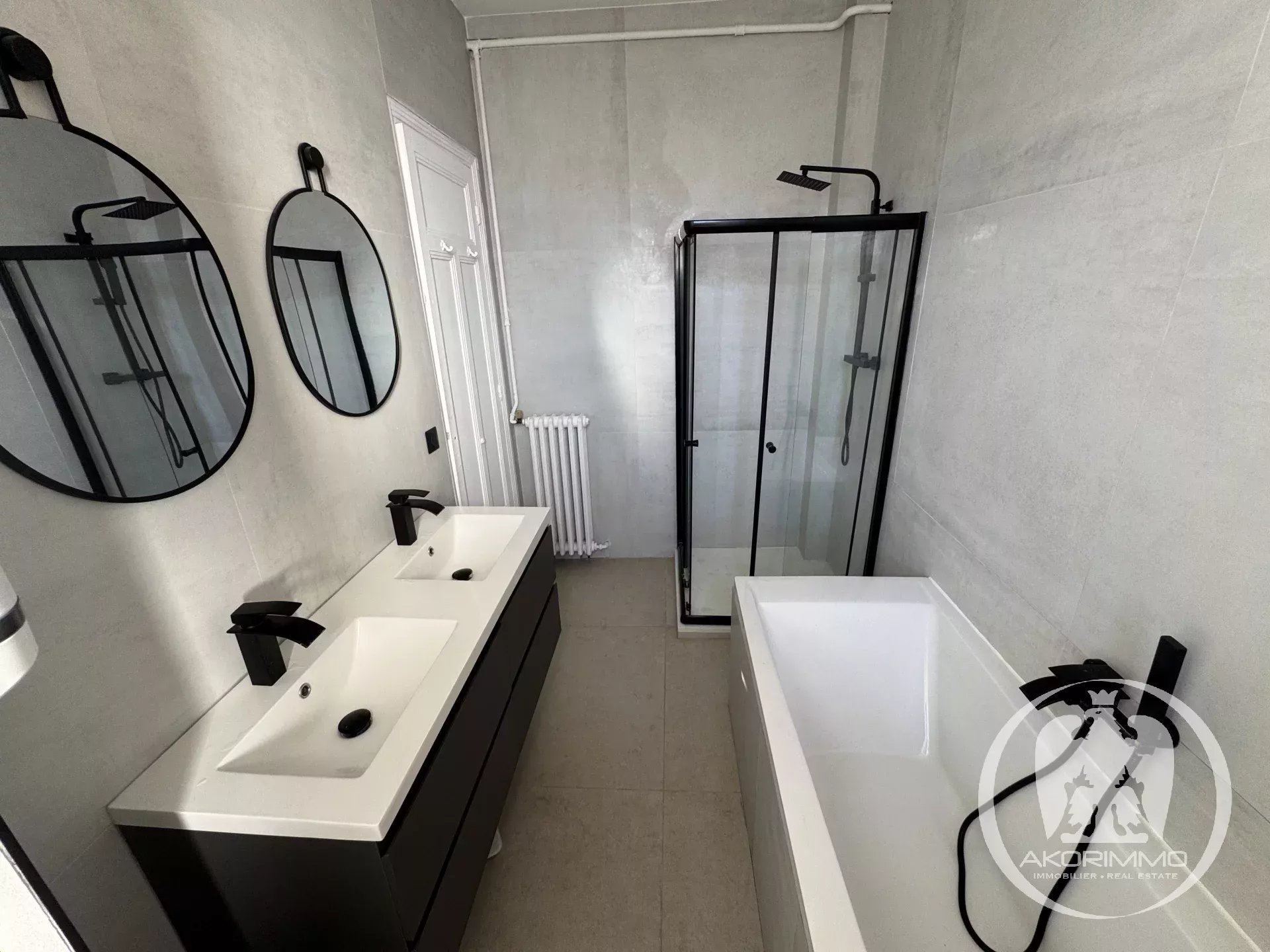 Appartement composé d'un séjour de 30M2 avec 6 fenêtres, deux belles chambres de 17M2, une cuisine indépendante entièrement équipée de 8M2, une salle de bain avec douche et baignoire, ainsi qu'un WC indépendant.