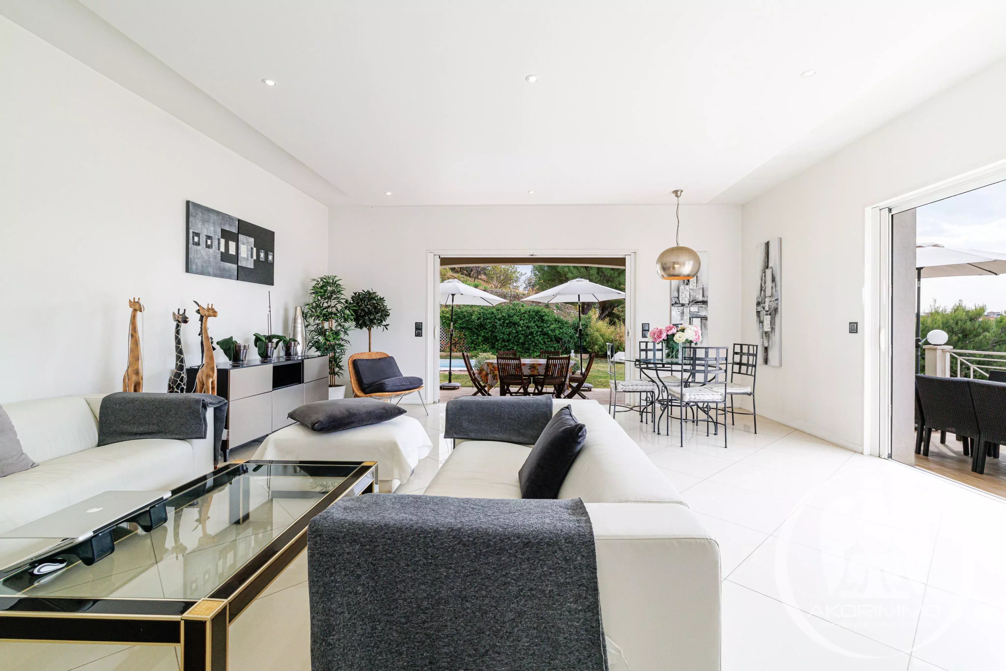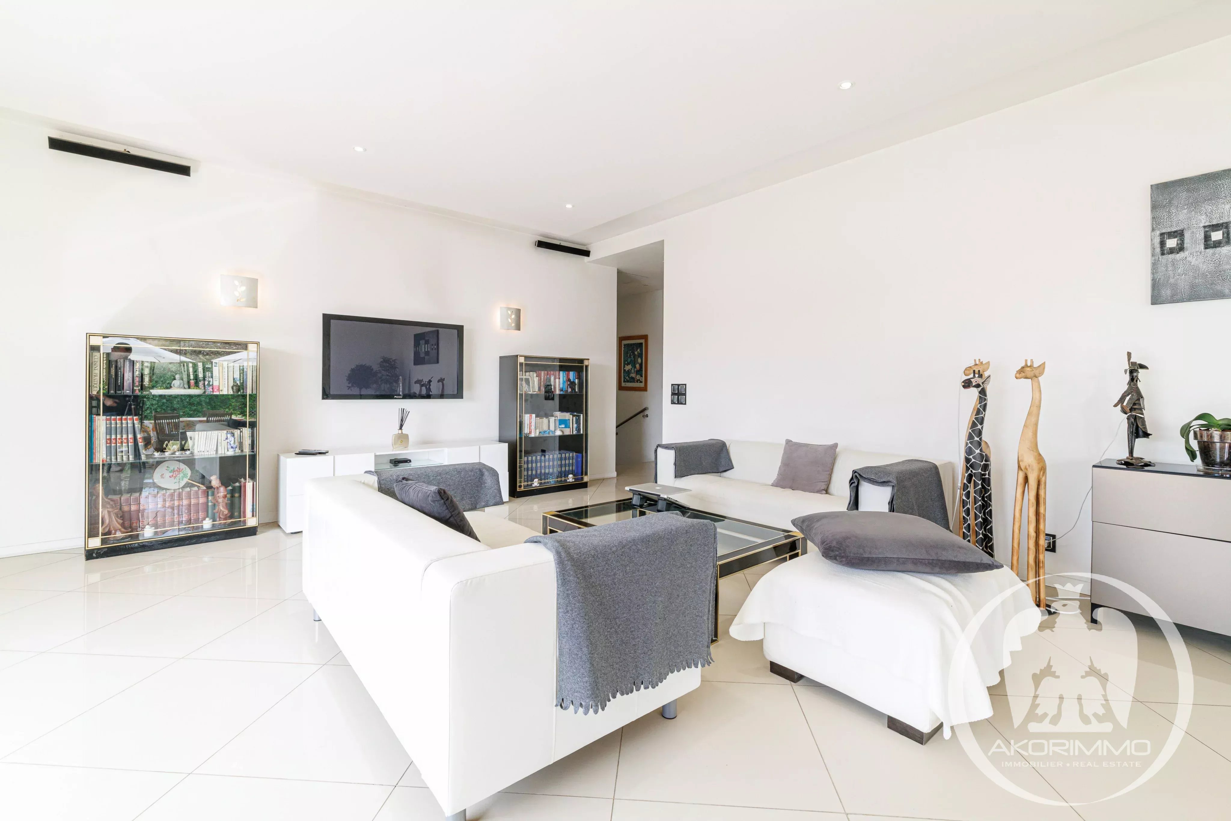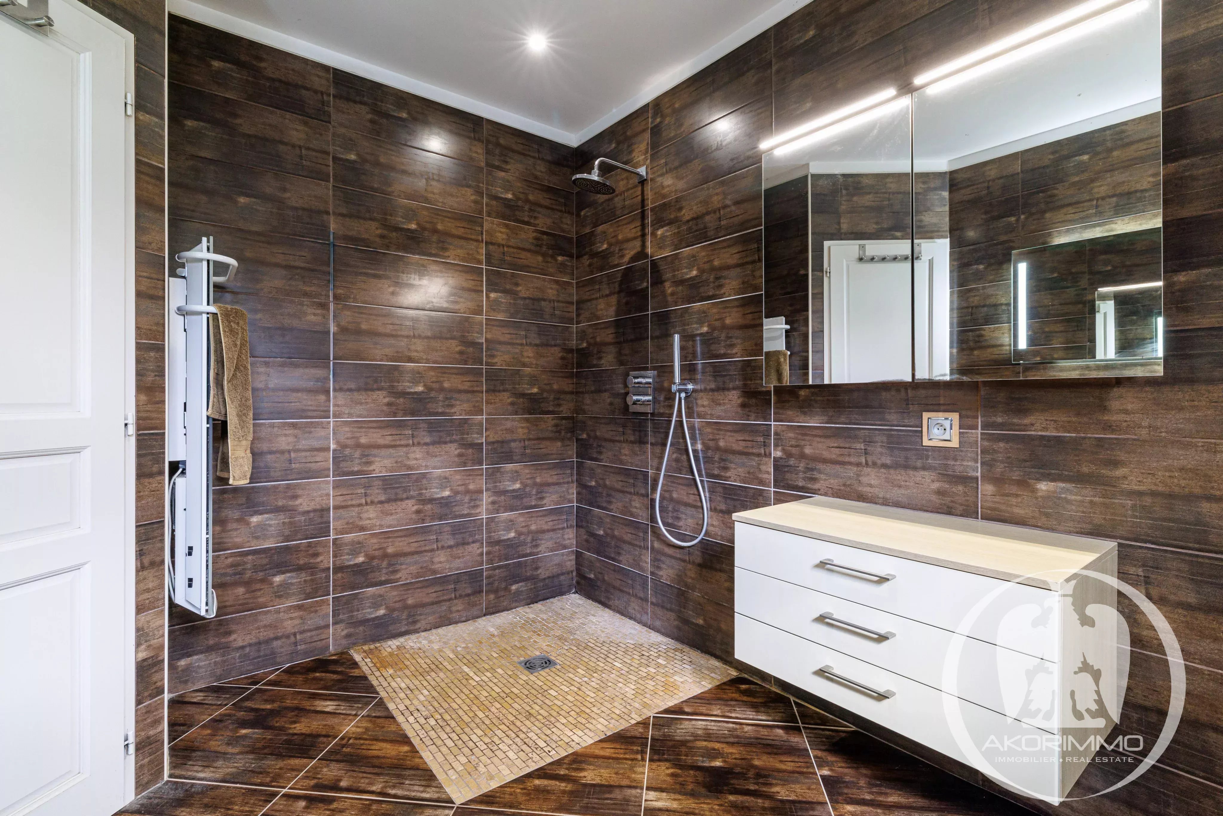 Au premier étage, avec menuiseries aluminium en galandage, un très beau séjour de 45 m² donnant sur une terrasse de 80 m², un jardin paysager et sa piscine.