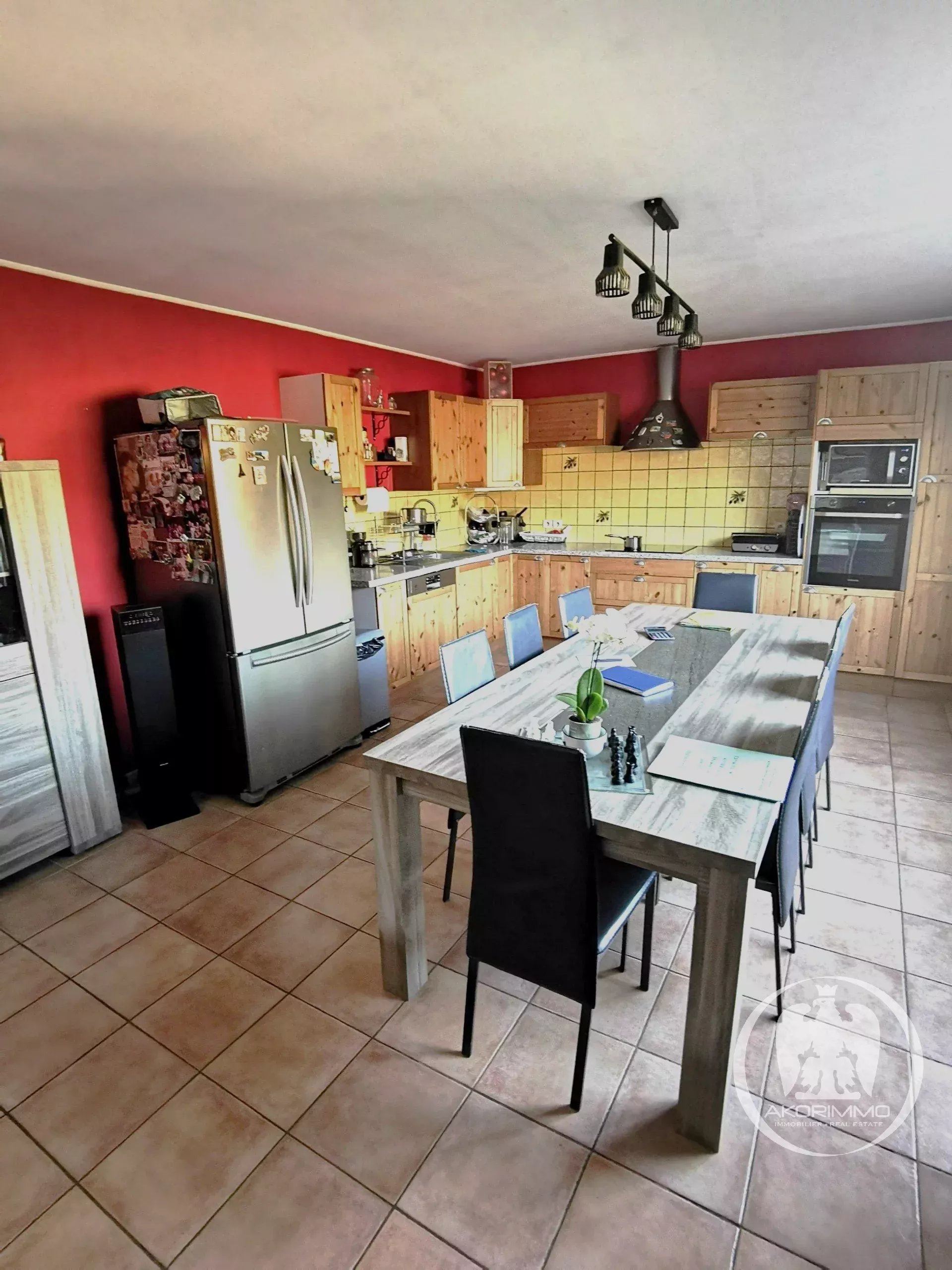 À l'étage, un appartement 4 pièces de 100 m² composé d'une pièce de vie de 38 m² avec cuisine ouverte entièrement équipée, 3 chambres de 10 et 11 m², une salle de bains, WC séparé et une pièce servant de lingerie. Chauffage par un poêle à granulés, double vitrage.
