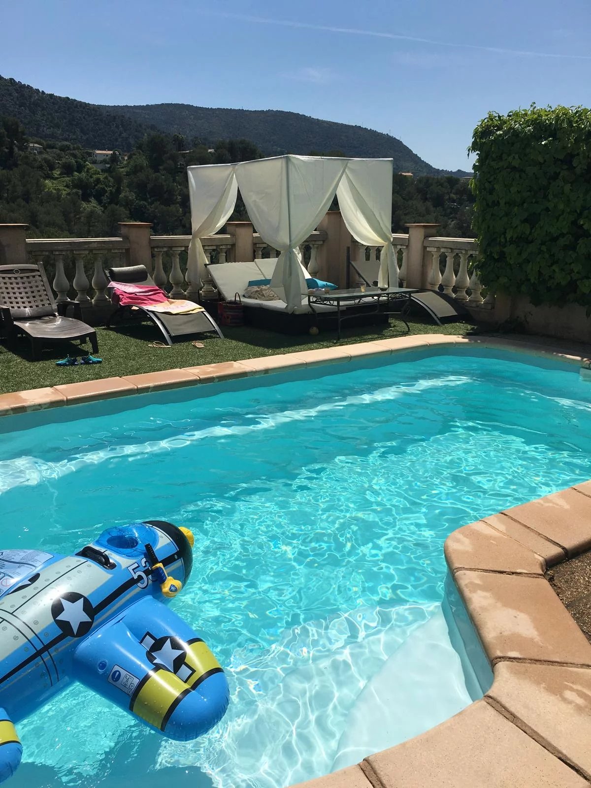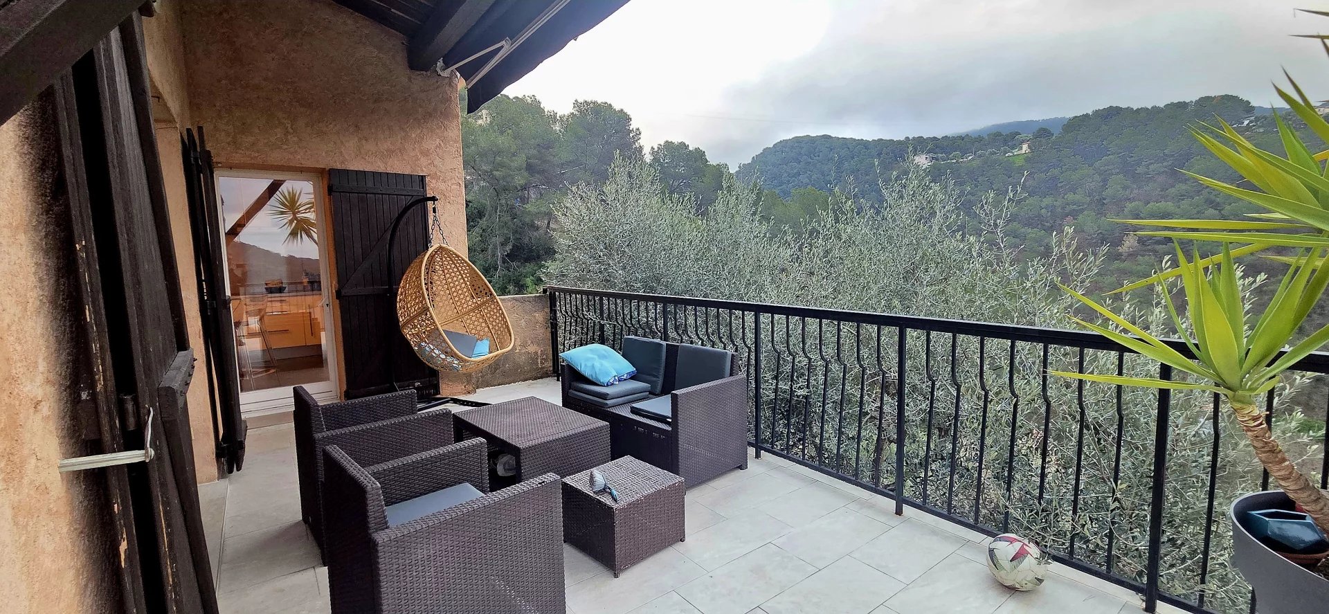 Deux grandes terrasses, entrée indépendante, nombreuses places de stationnement, local extérieur, oliveraie d’environ 380 m² et piscine partagée.