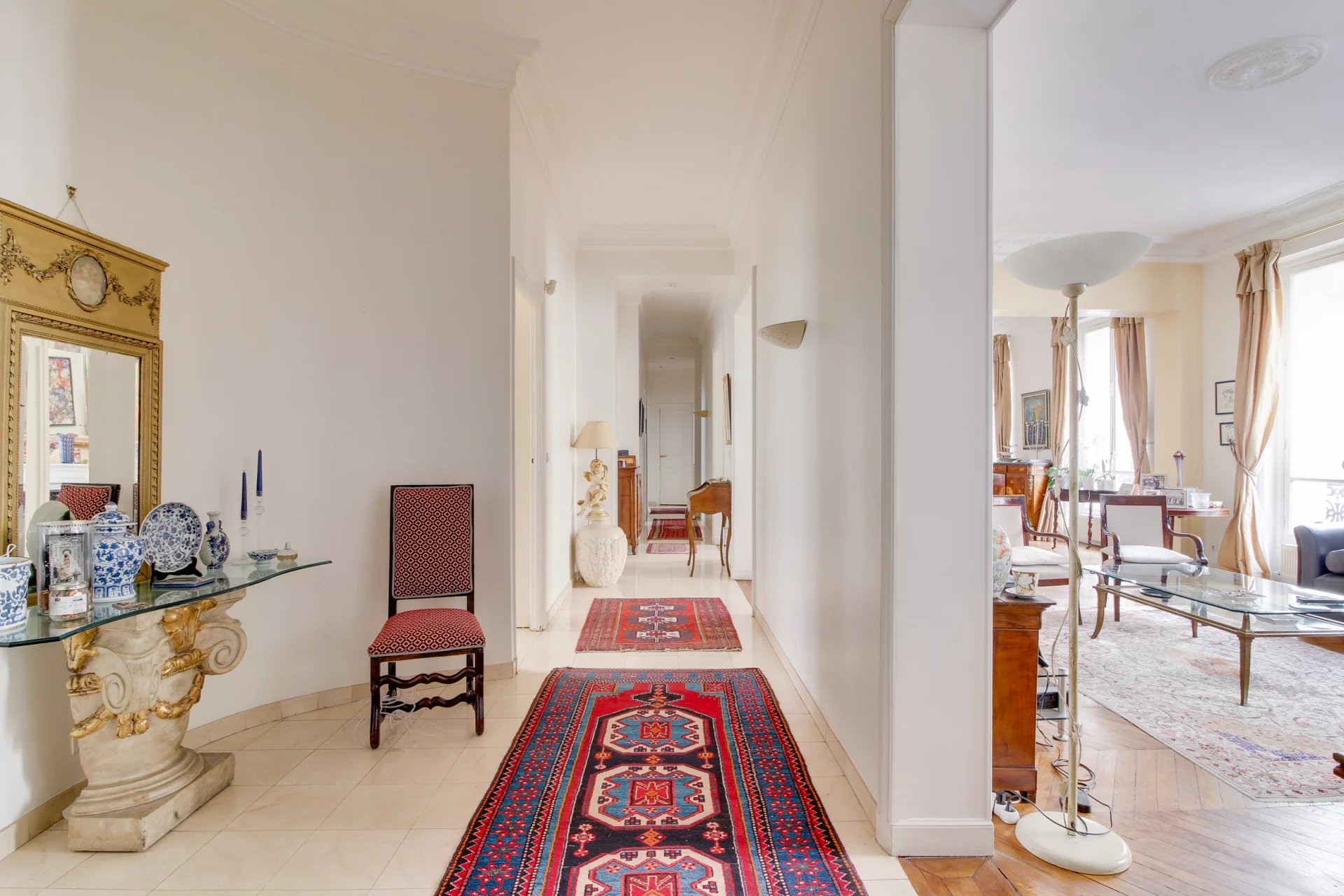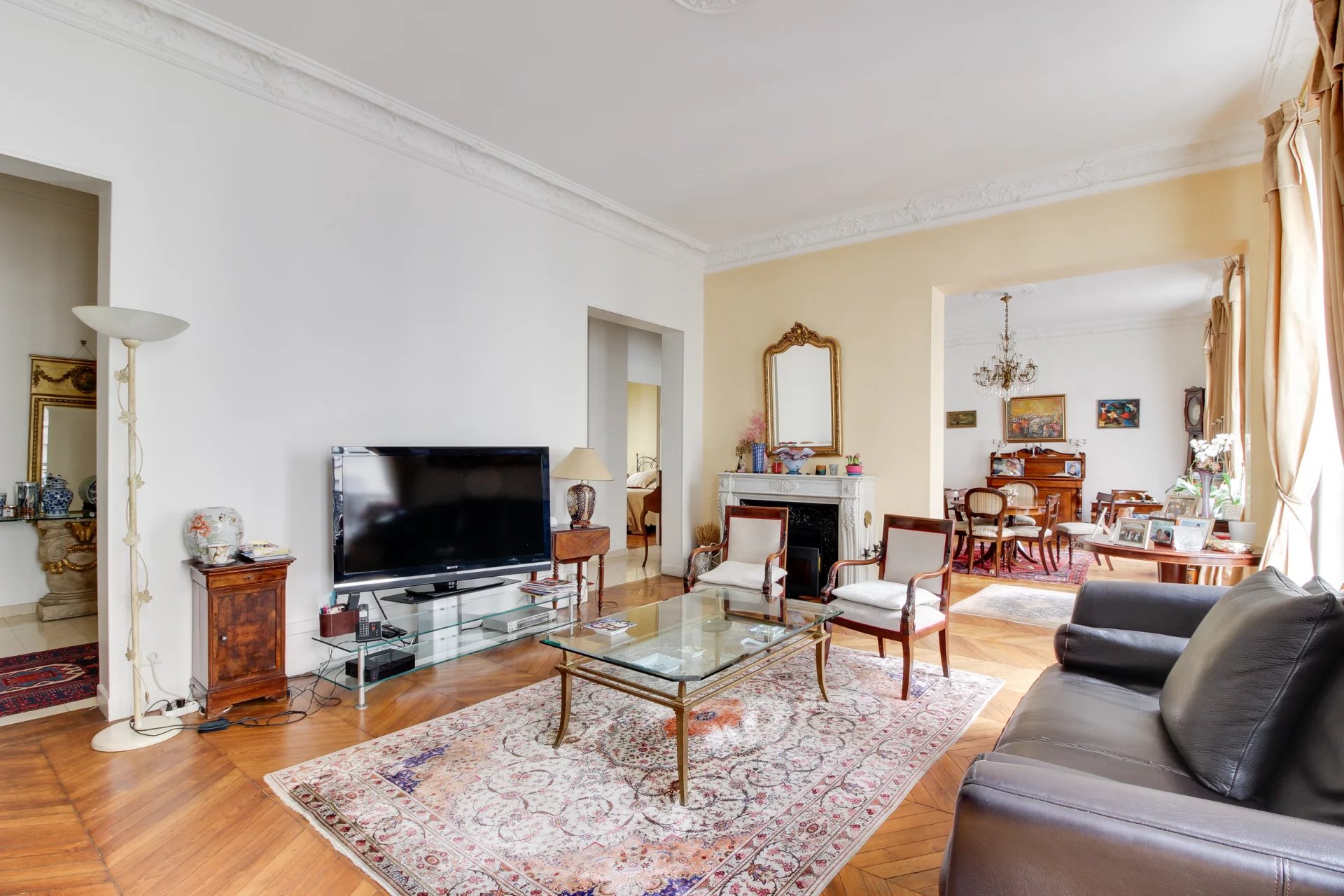 Superbe appartement familial de 165 m², composé d’une entrée élégante menant à un vaste séjour lumineux et une salle à manger, donnant sur la rue du Faubourg Saint Honoré.
