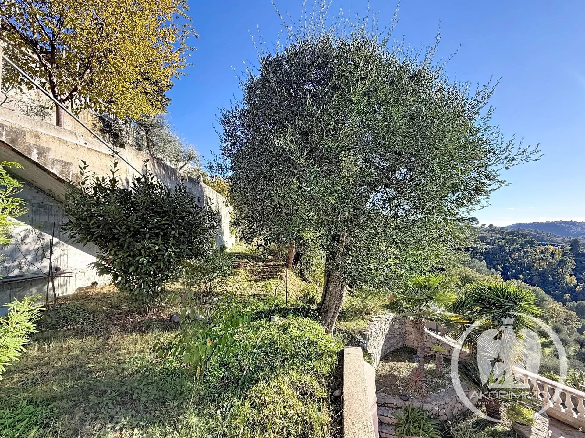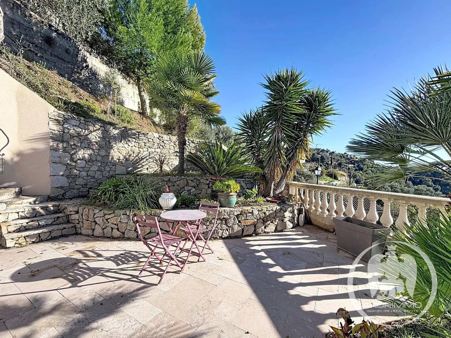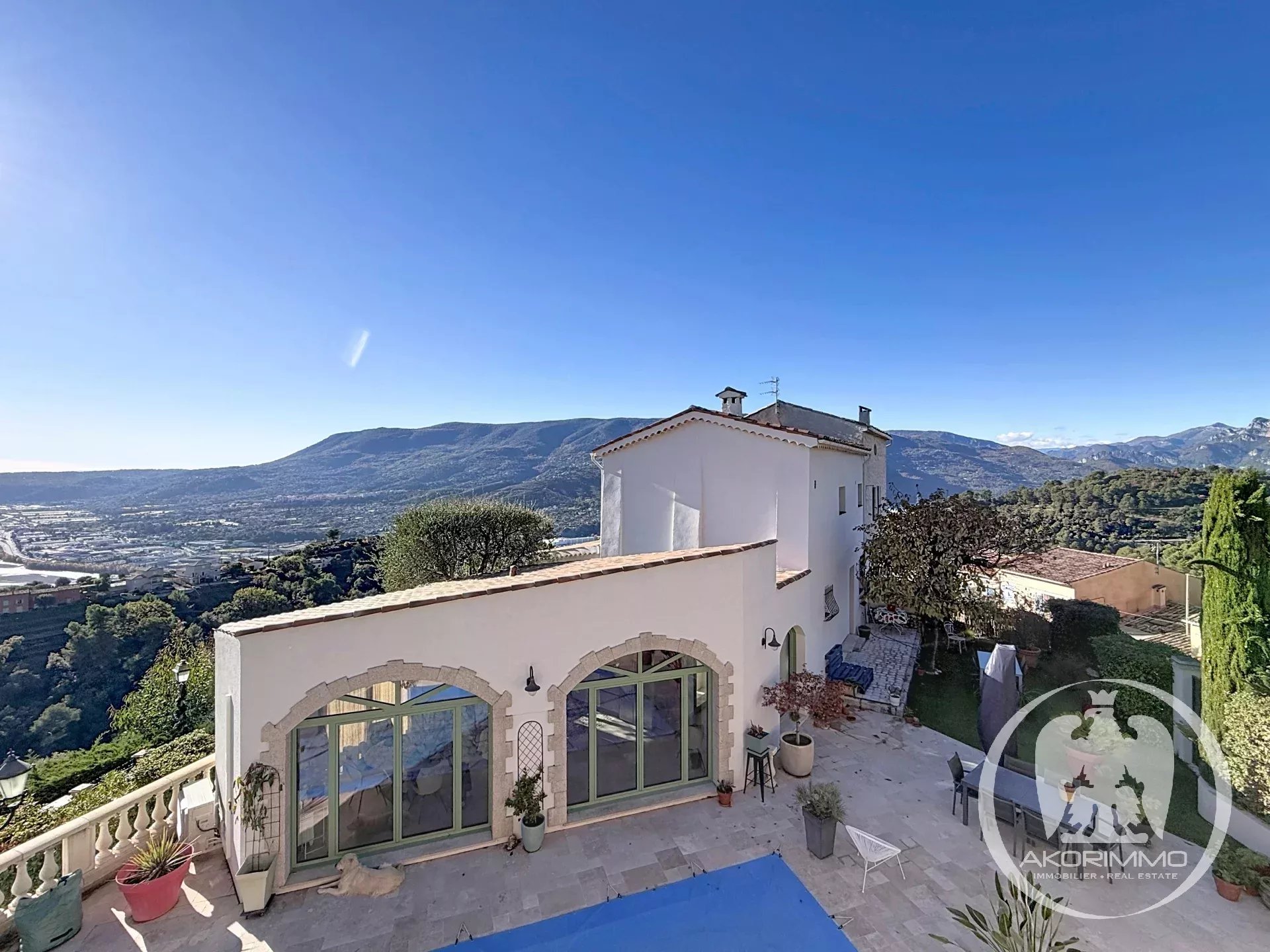Agrandie et rénovée en 2021, la maison — discrètement jumelée — bénéficie d’une exposition plein sud avec une vue imprenable sur la Plaine du Var, ce qui donne une luminosité optimale toute au long de la journée.
