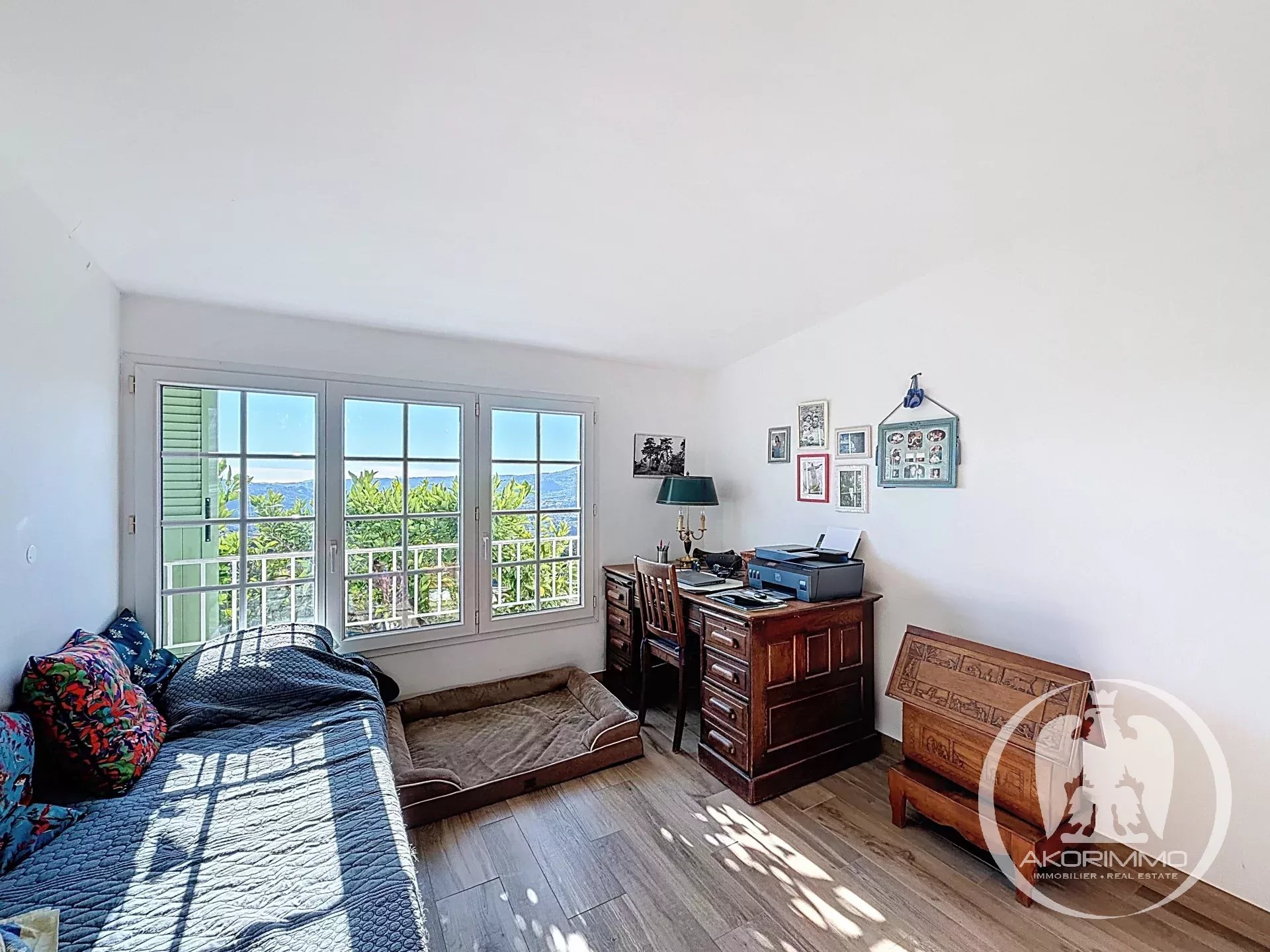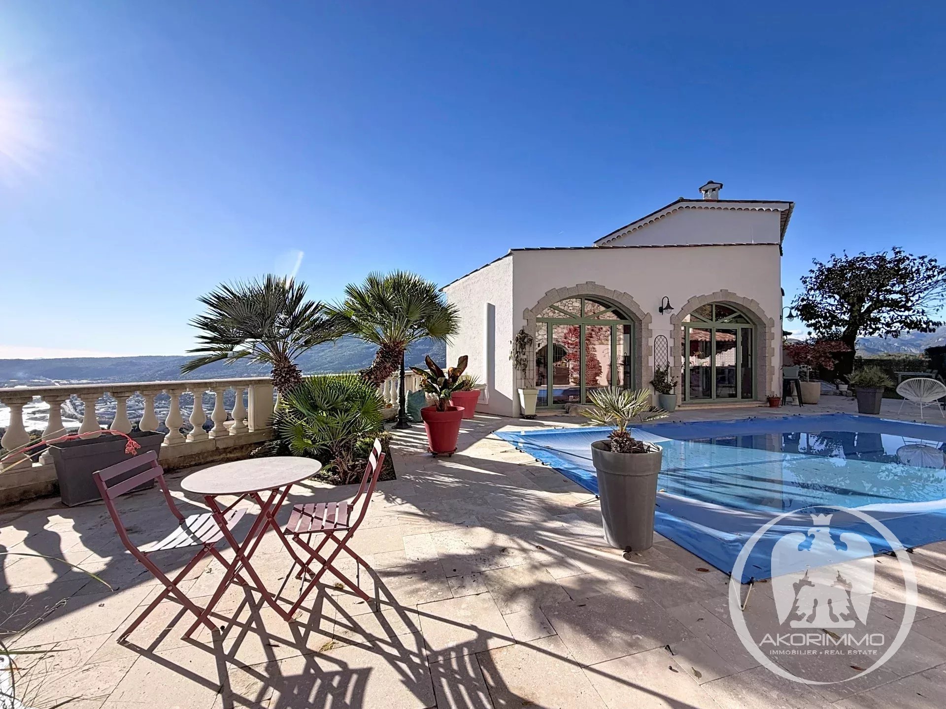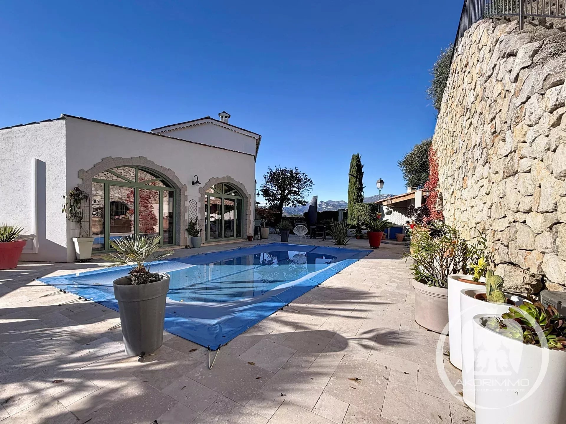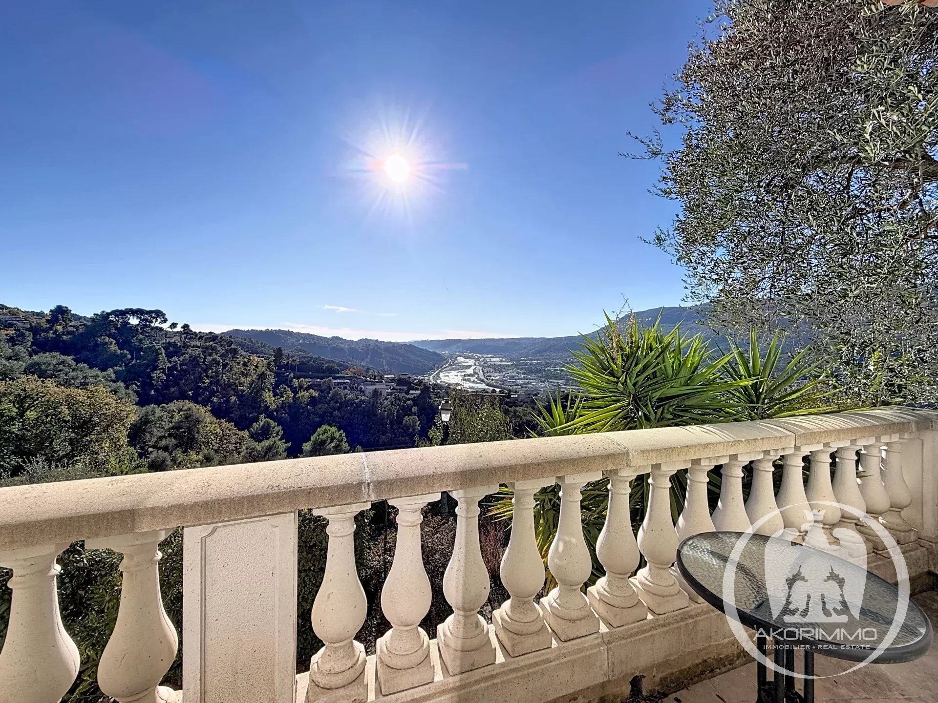 Agrandie et rénovée en 2021, la maison — discrètement jumelée — bénéficie d’une exposition plein sud avec une vue imprenable sur la Plaine du Var, ce qui donne une luminosité optimale toute au long de la journée.