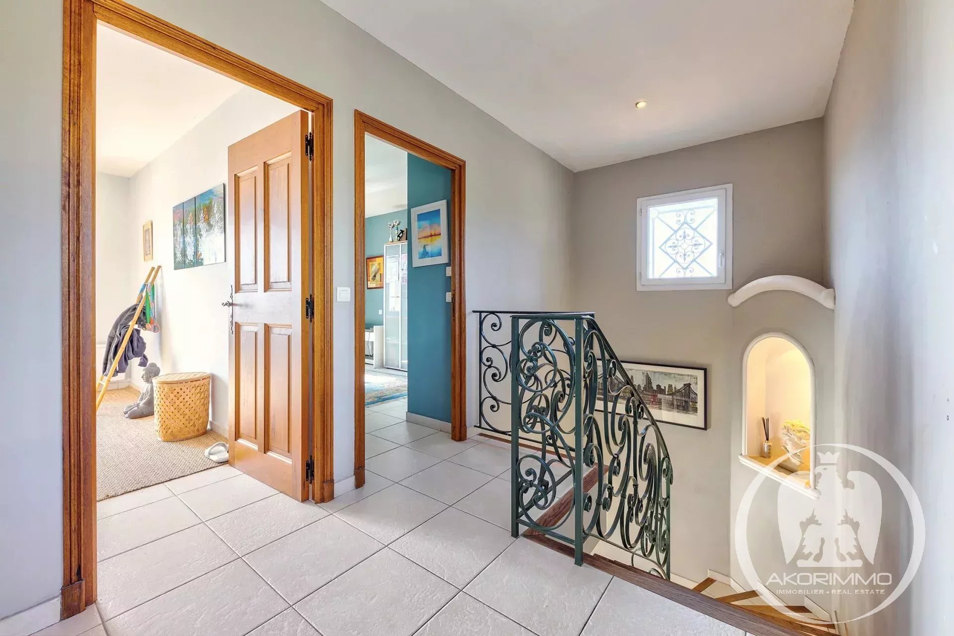 À l’étage : 3 chambres, une salle de jeux, une salle de bains, des toilettes séparées et un balcon.