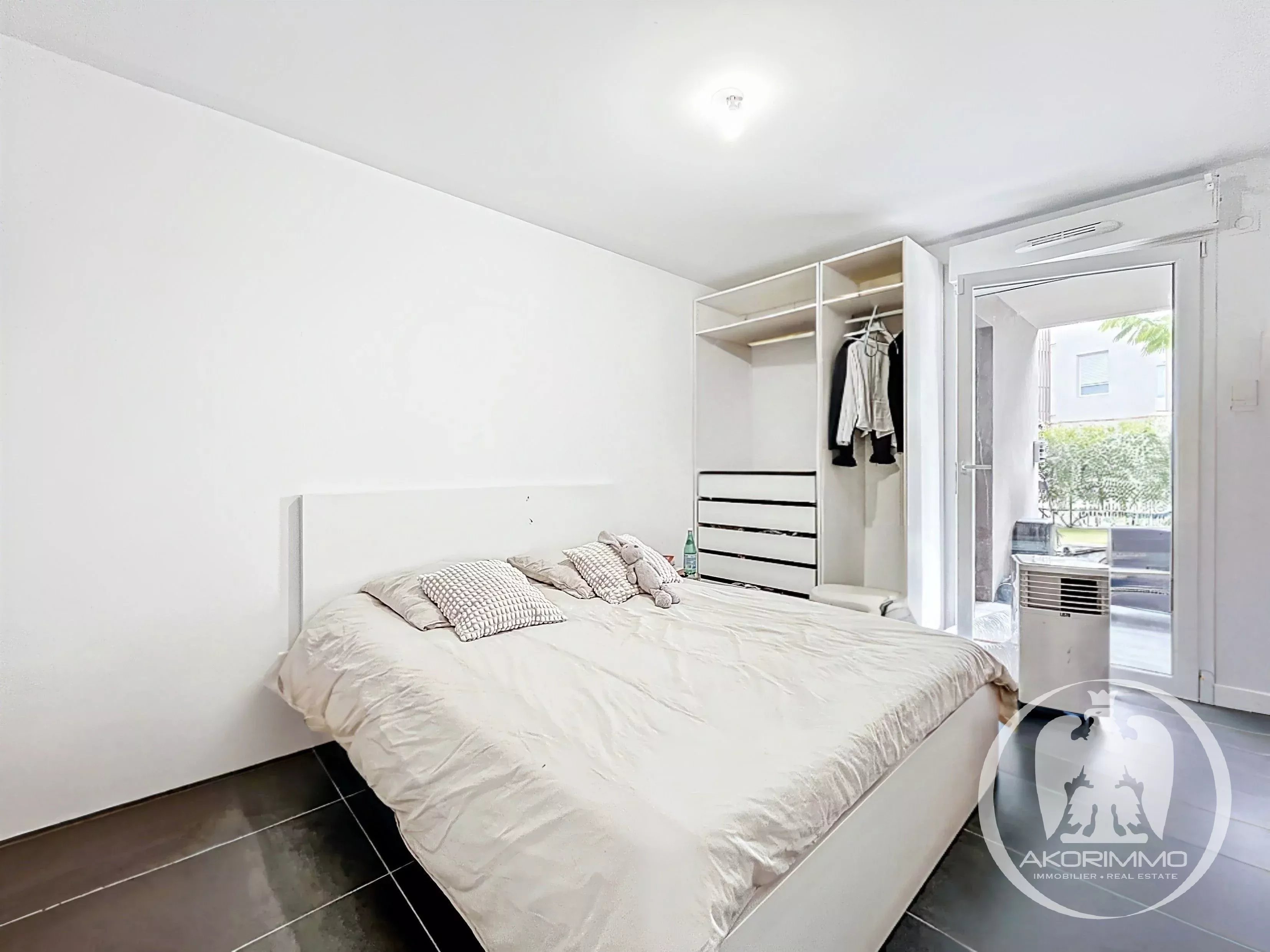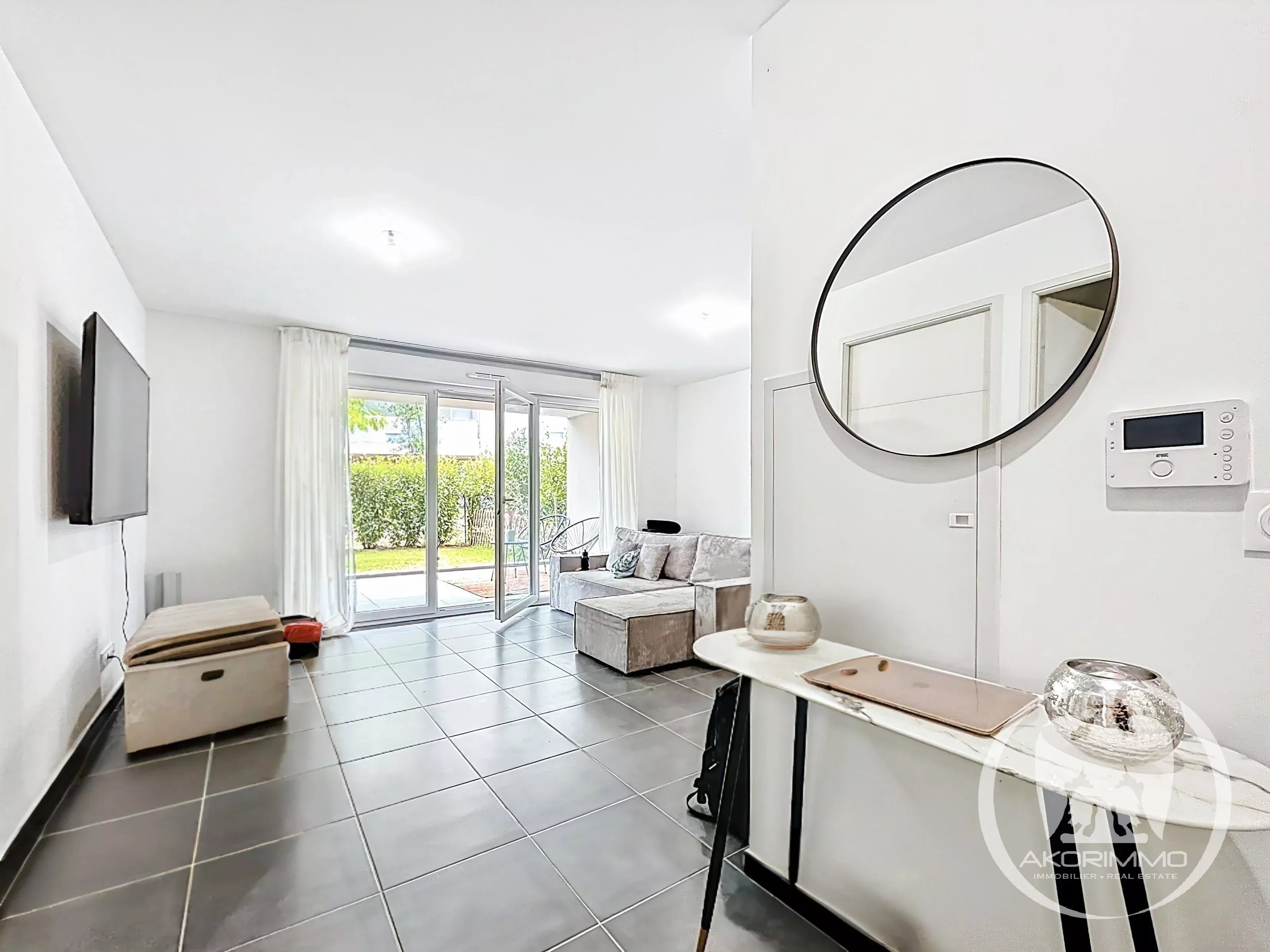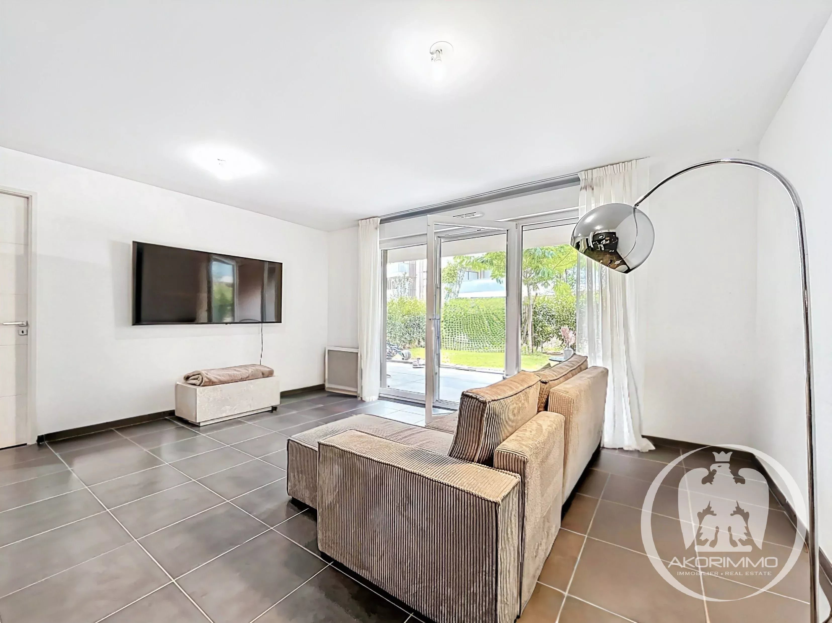 È composto da un soggiorno luminoso con cucina a vista, che si apre su un terrazzo coperto e su un piacevole giardino privato. La camera da letto gode anch’essa di un accesso diretto all’esterno, per un comfort ottimale. Un bagno moderno e servizi igienici separati completano la proprietà.