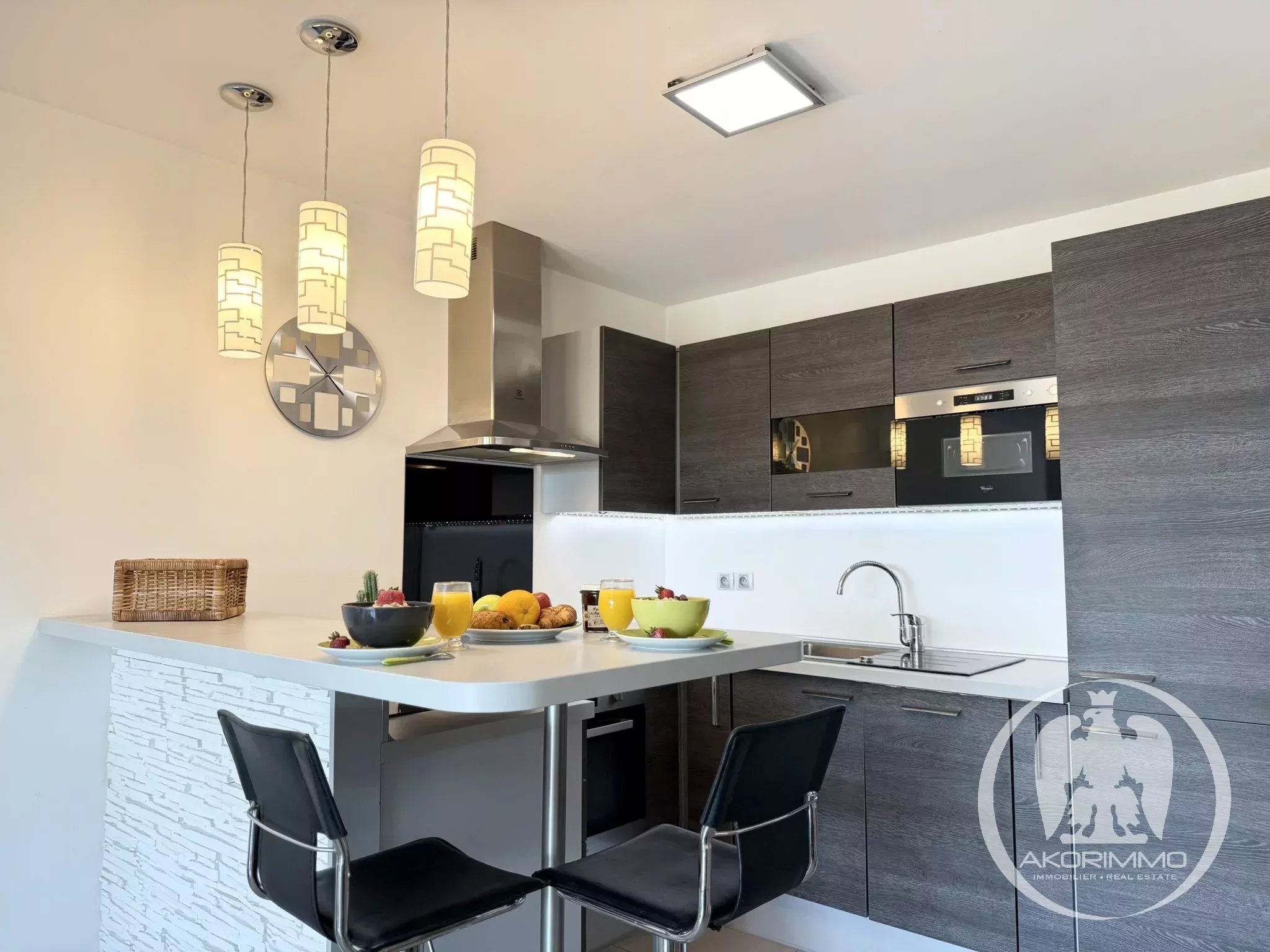 - Cucina a vista completamente attrezzata con isola/bar (forno, microonde, piano cottura, cappa, numerosi vani contenitori).
